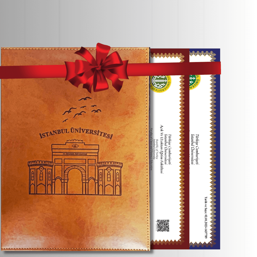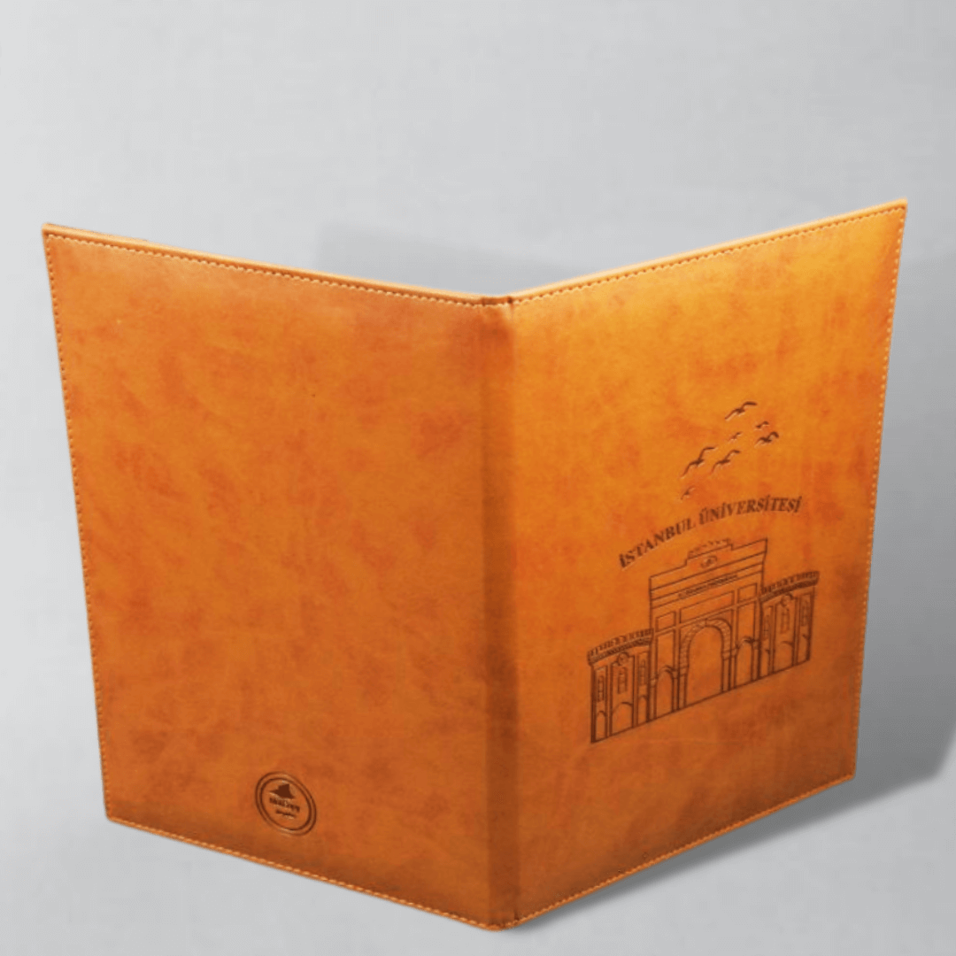 Diploma dosyası özel olarak tasarlanmıştır. Deri üzerine yaldızlı baskı olarak işlenmiştir. Hem hatıra olarak saklayacağınız